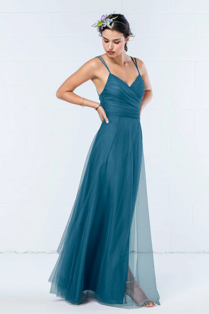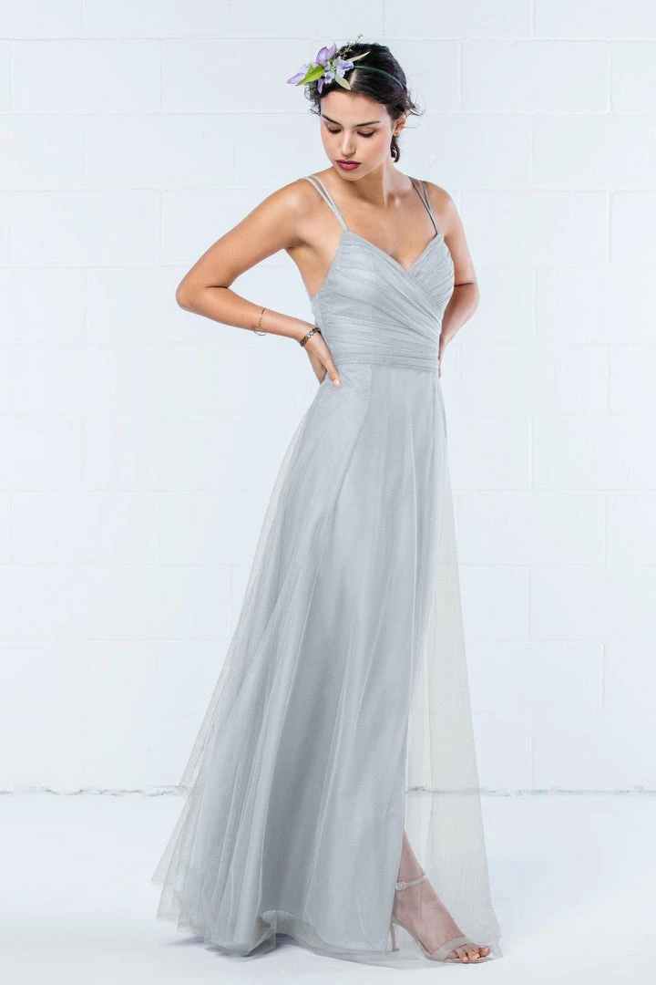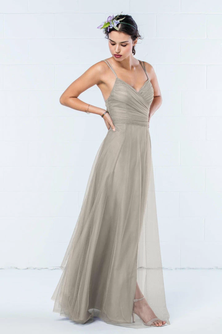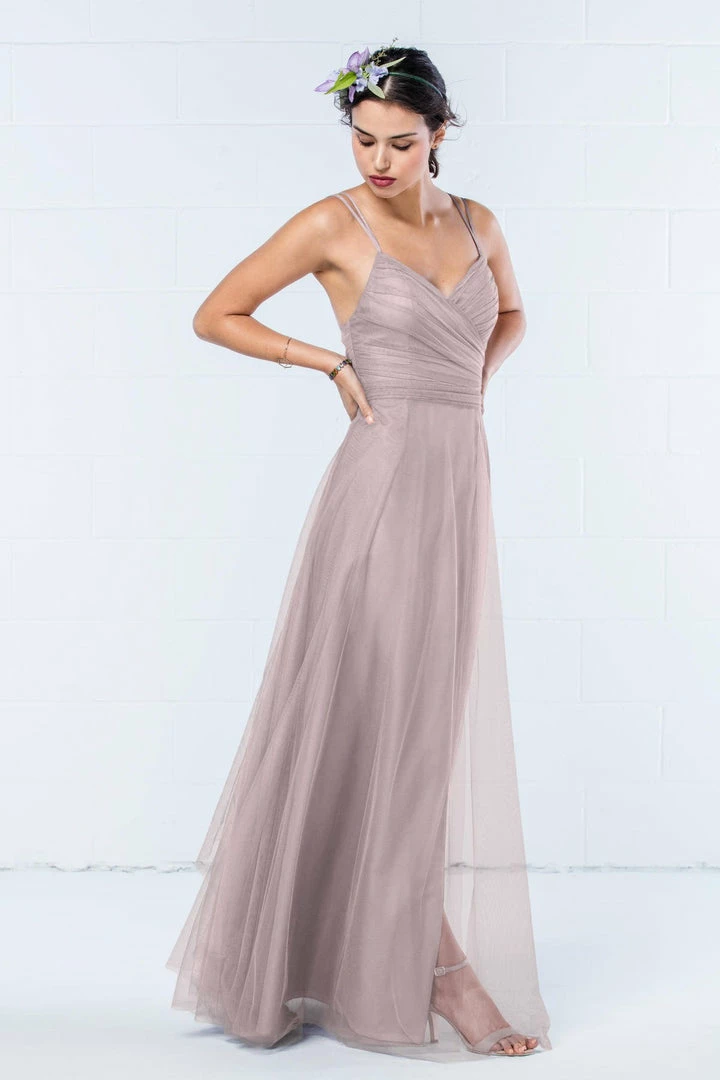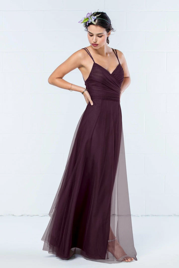 Modern and romantic all in one dress. This bobbinet style features a shirred crisscross bodice with double spaghetti straps that create a delicate v-back. A soft, skirt creates movement. Also available in knee length.