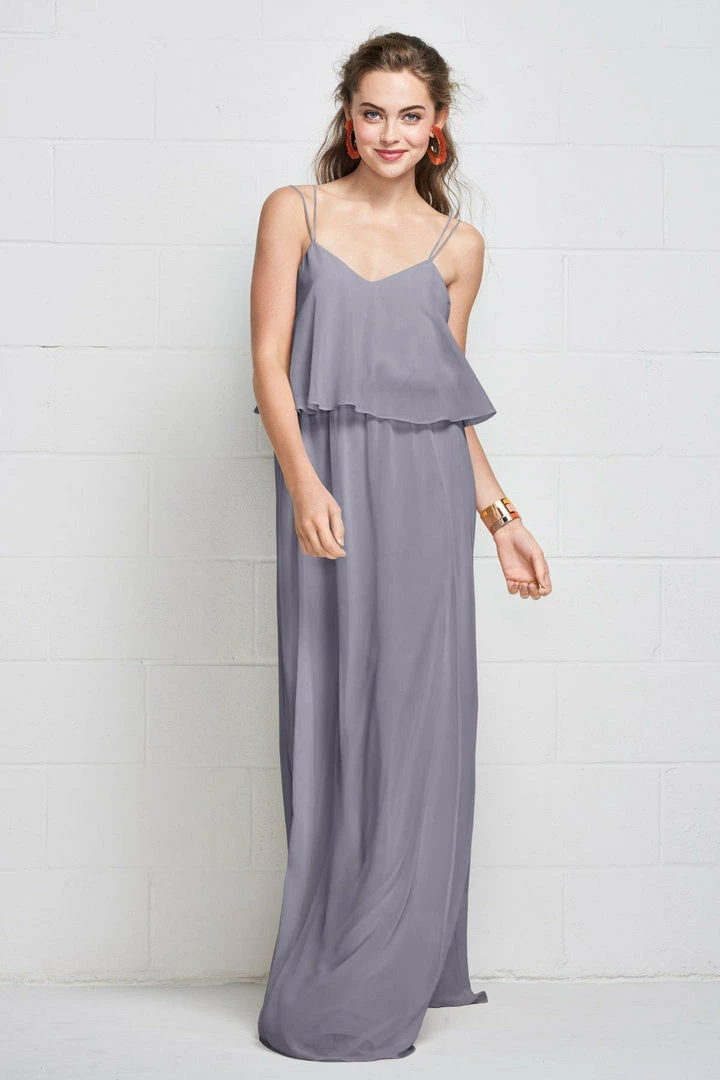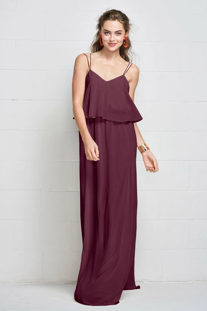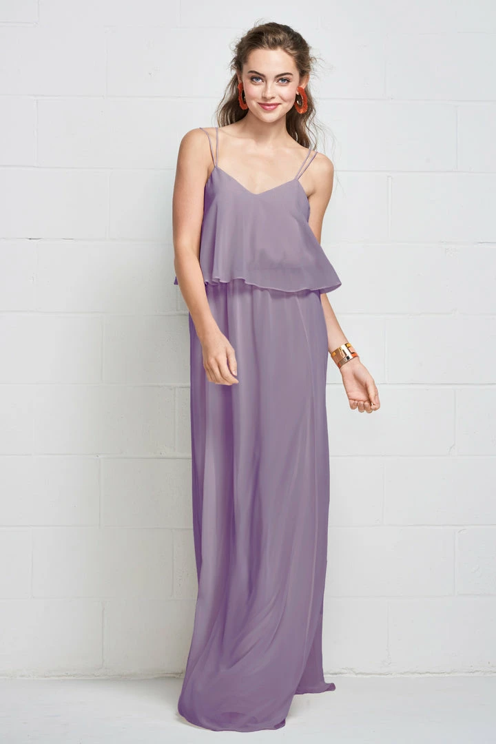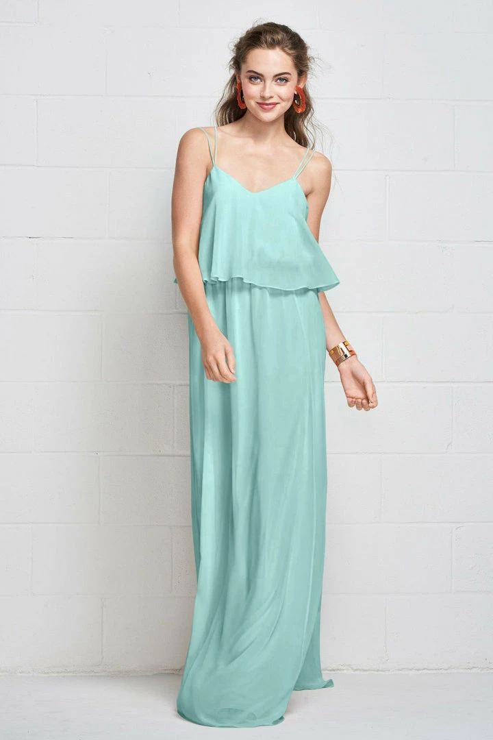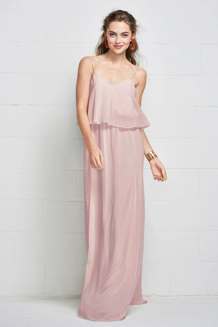 Slim straps fade into the flowy plush chiffon gown clinched with an elastic waist, creating a carefree, comfortable look.