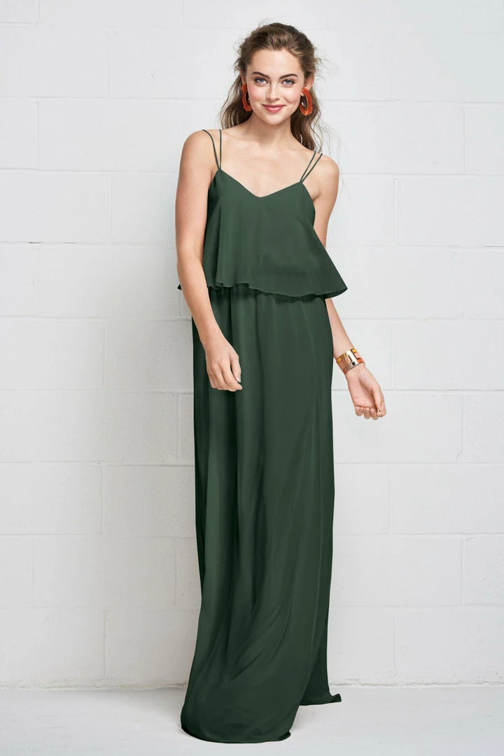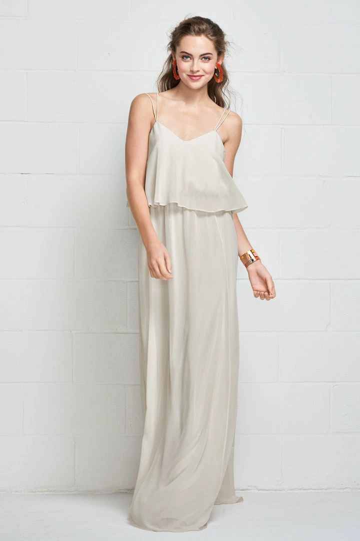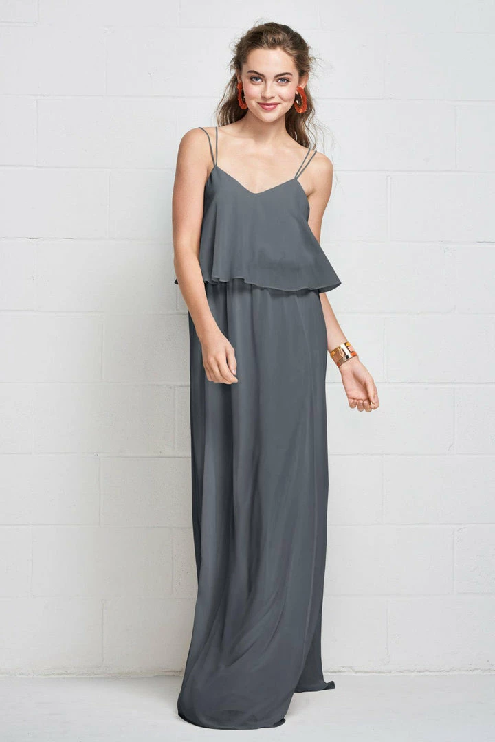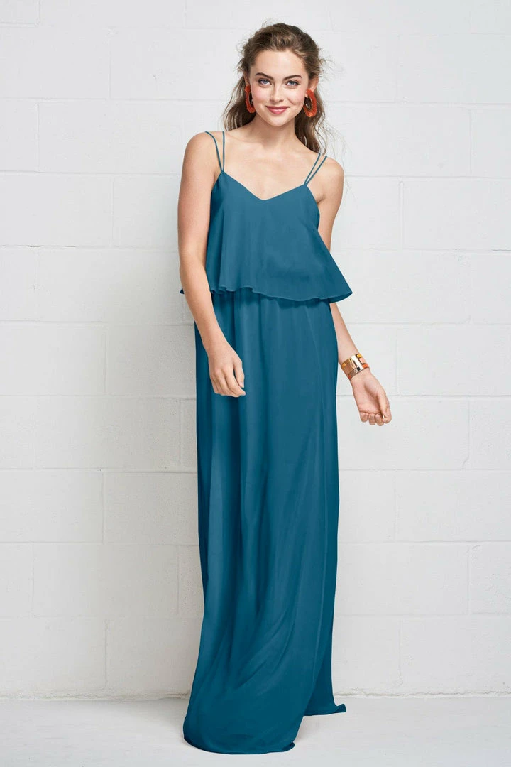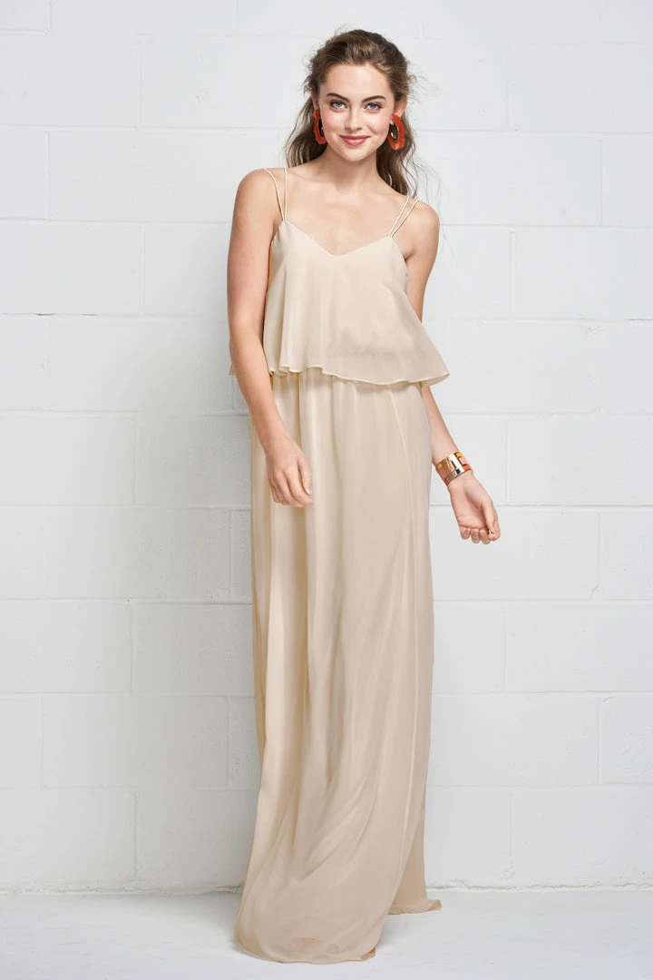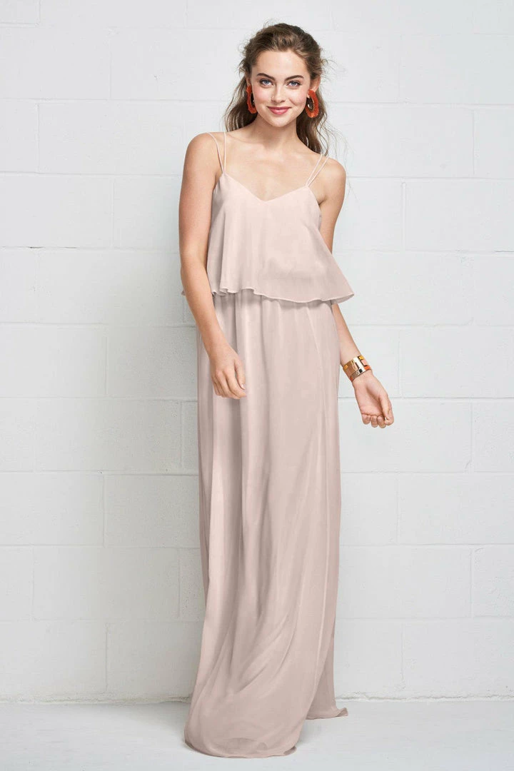 Slim straps fade into the flowy plush chiffon gown clinched with an elastic waist, creating a carefree, comfortable look.