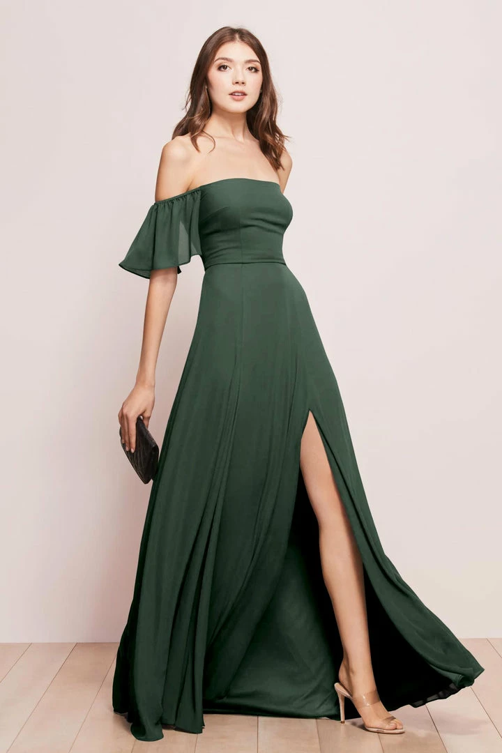 Show-off-your-shoulders neckline? Check. Flirty, floaty sleeves? Check. Thigh-high slit? Check. Basically, this floor-length gown has got it all.